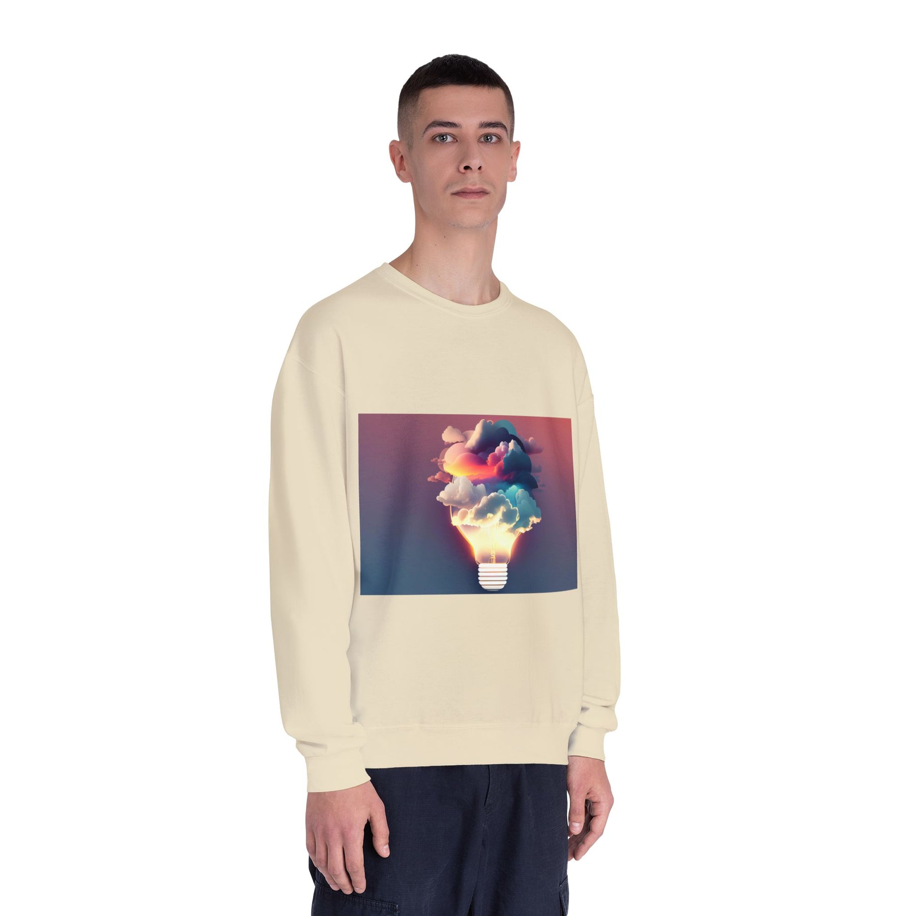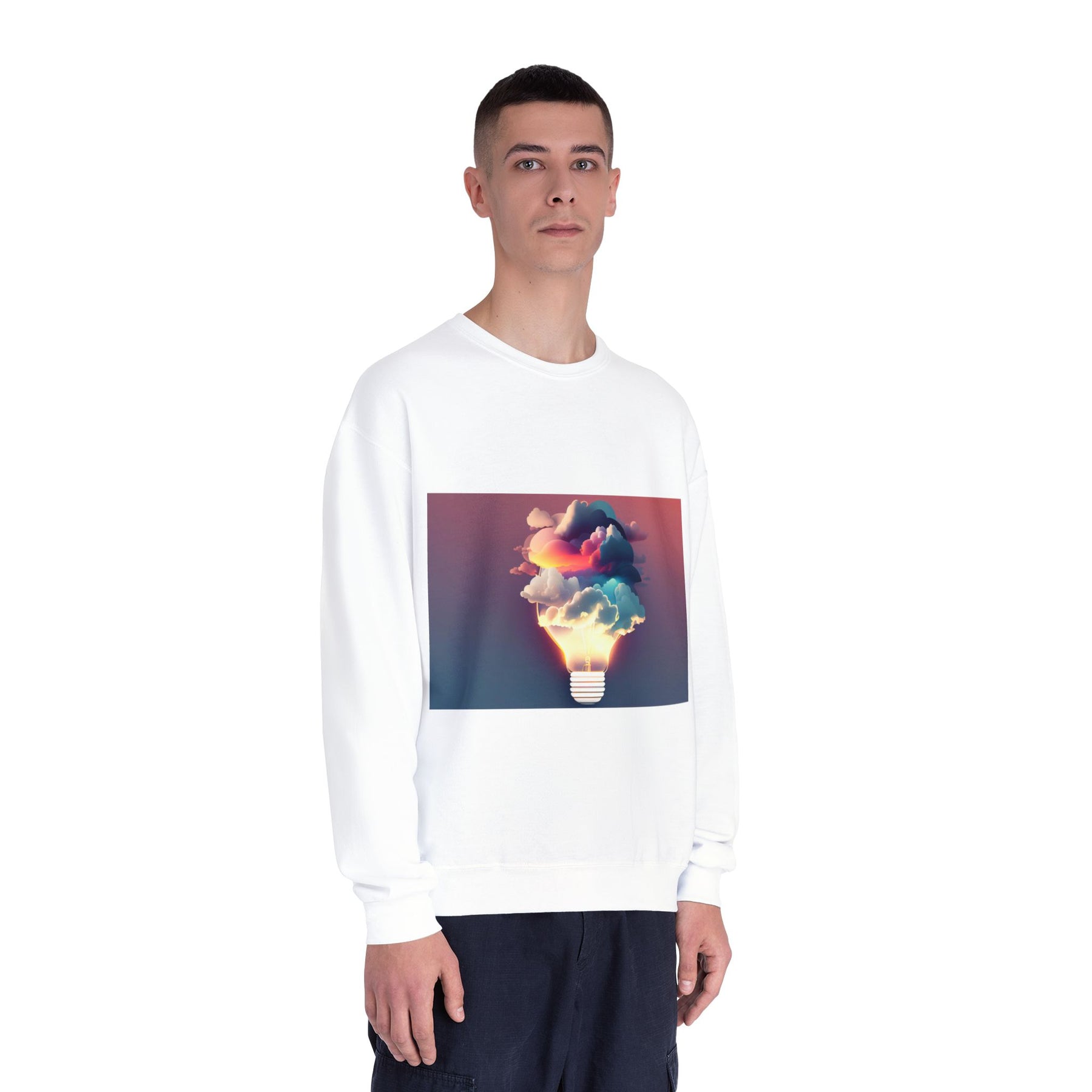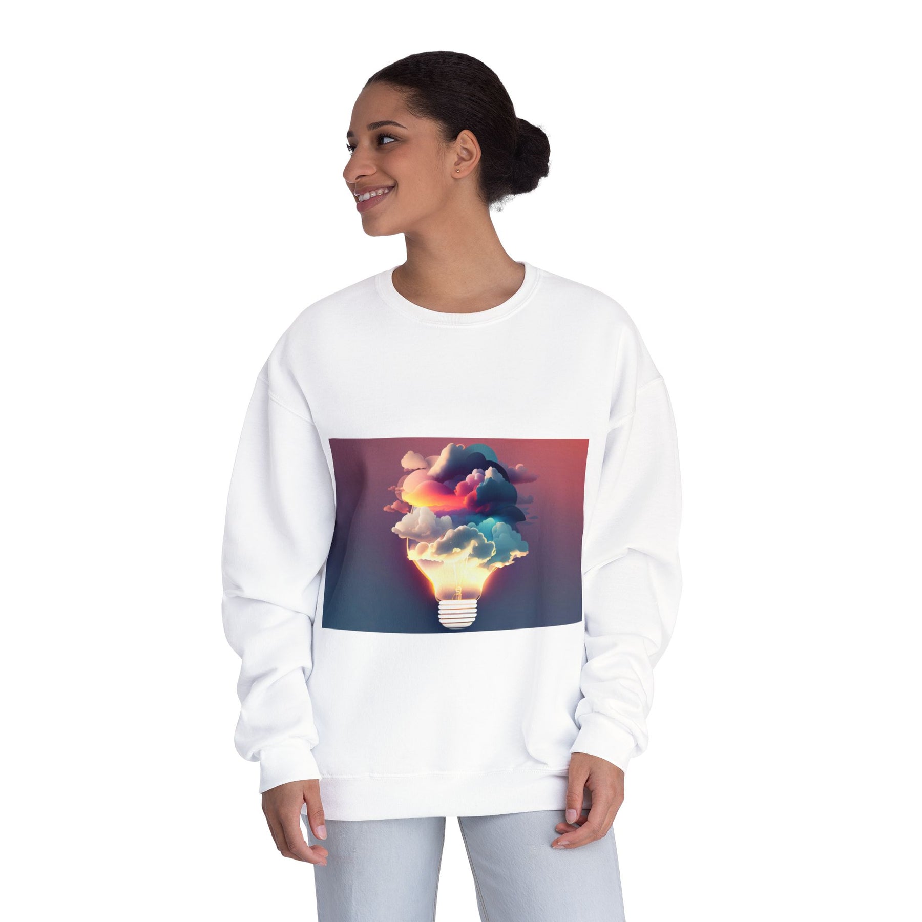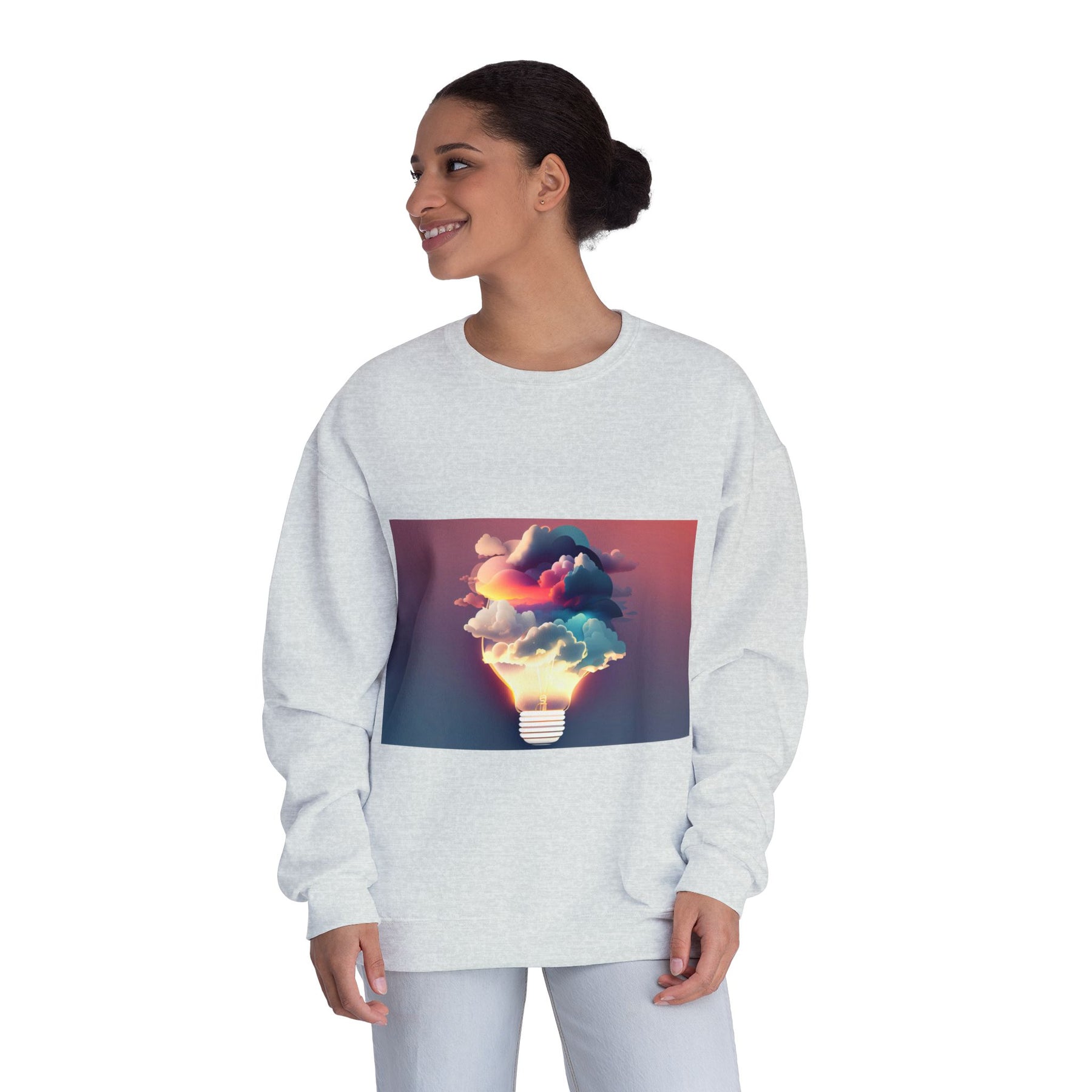 This cozy crewneck carries a spark of imaginative energy — a soft white sweatshirt printed with a dreamy lightbulb-cloud design that feels like inspiration you can wear. The image blends warm sunset hues and cool blues into a floating cloud that pours from a glowing bulb, giving a subtle, artful pop against the clean, relaxed silhouette. It layers easily over tees or pairs with jeans for long studio sessions, late-night brainstorming, gallery visits, or quiet walks when your mind needs a little color. The fabric has a substantial, brushed interior that holds shape and warmth while staying soft next to the skin, so the sweatshirt becomes a go-to for creative routines and everyday comfort.