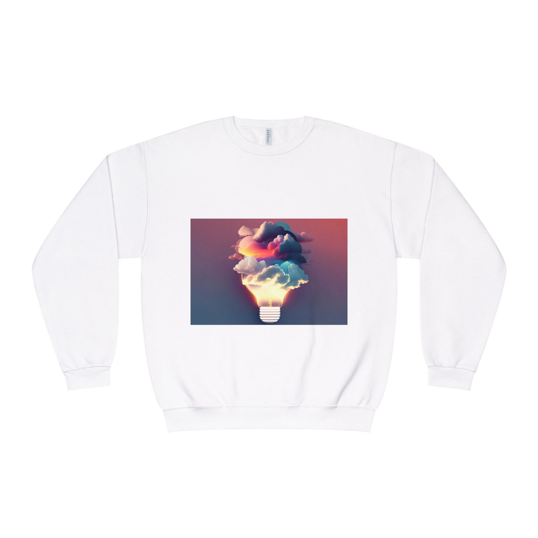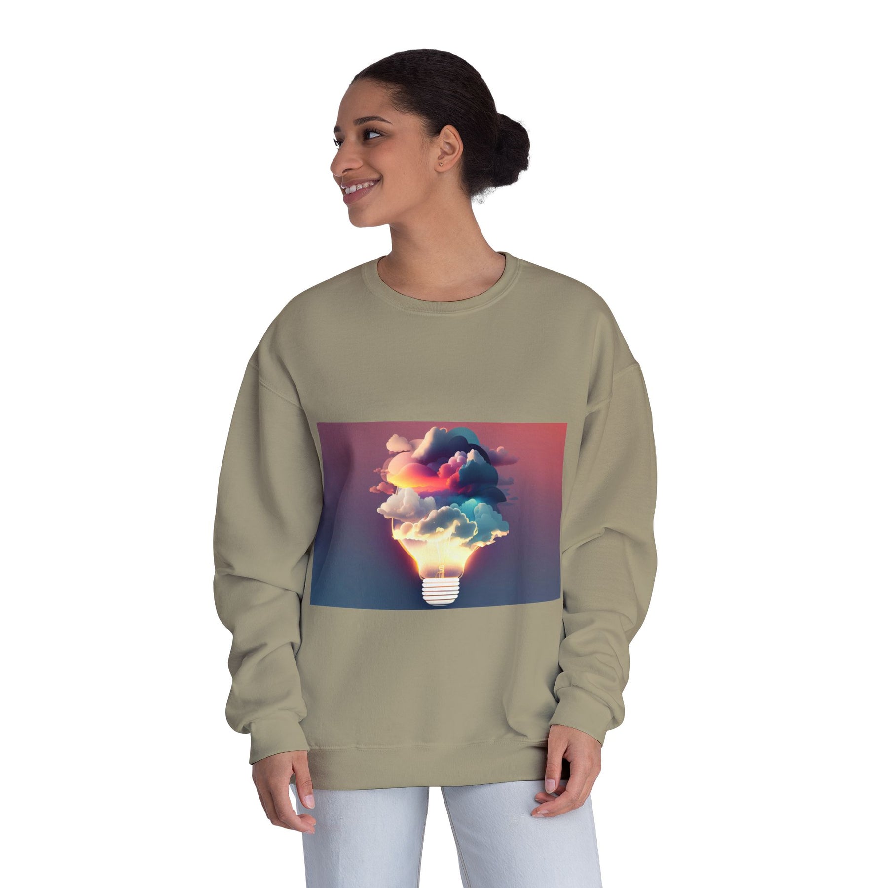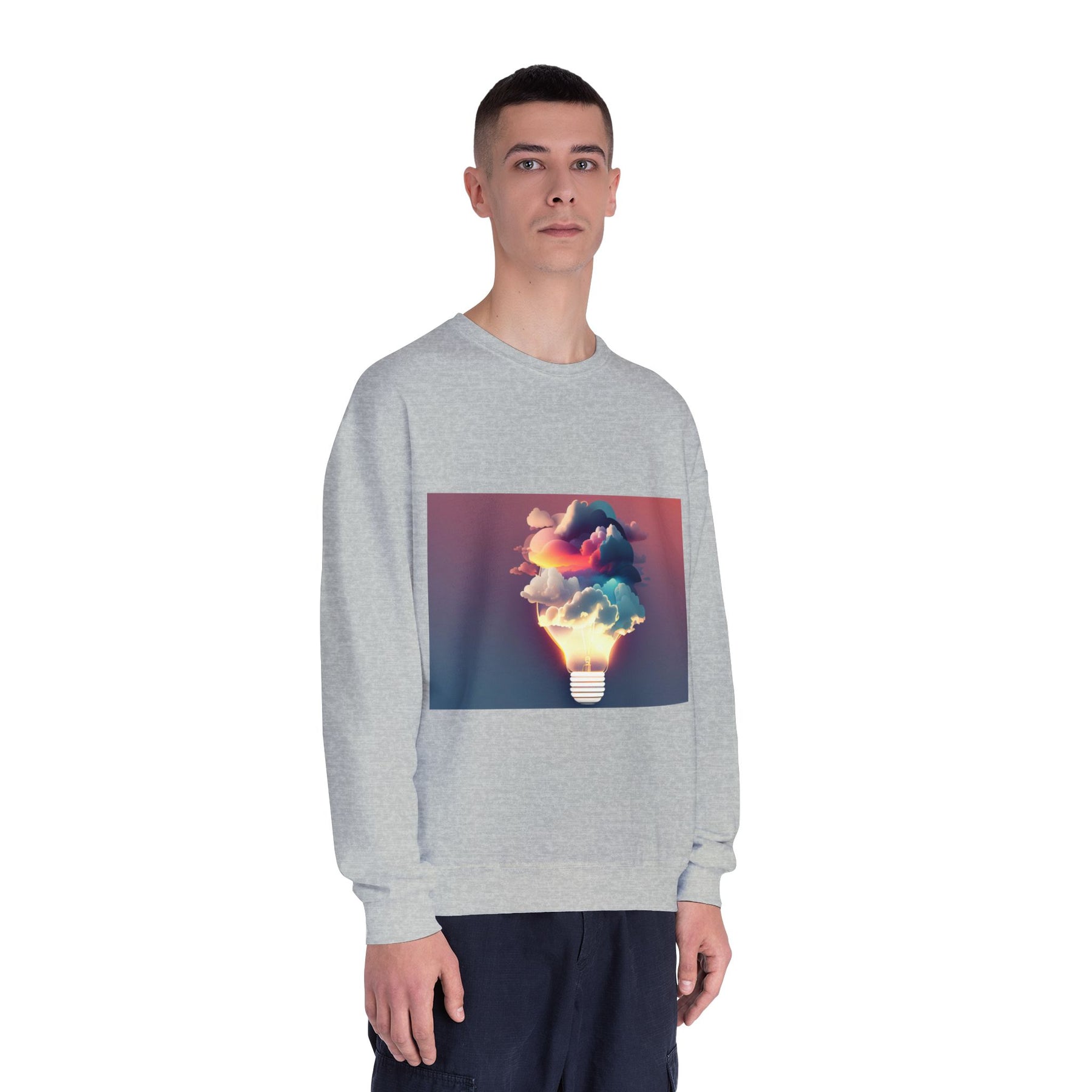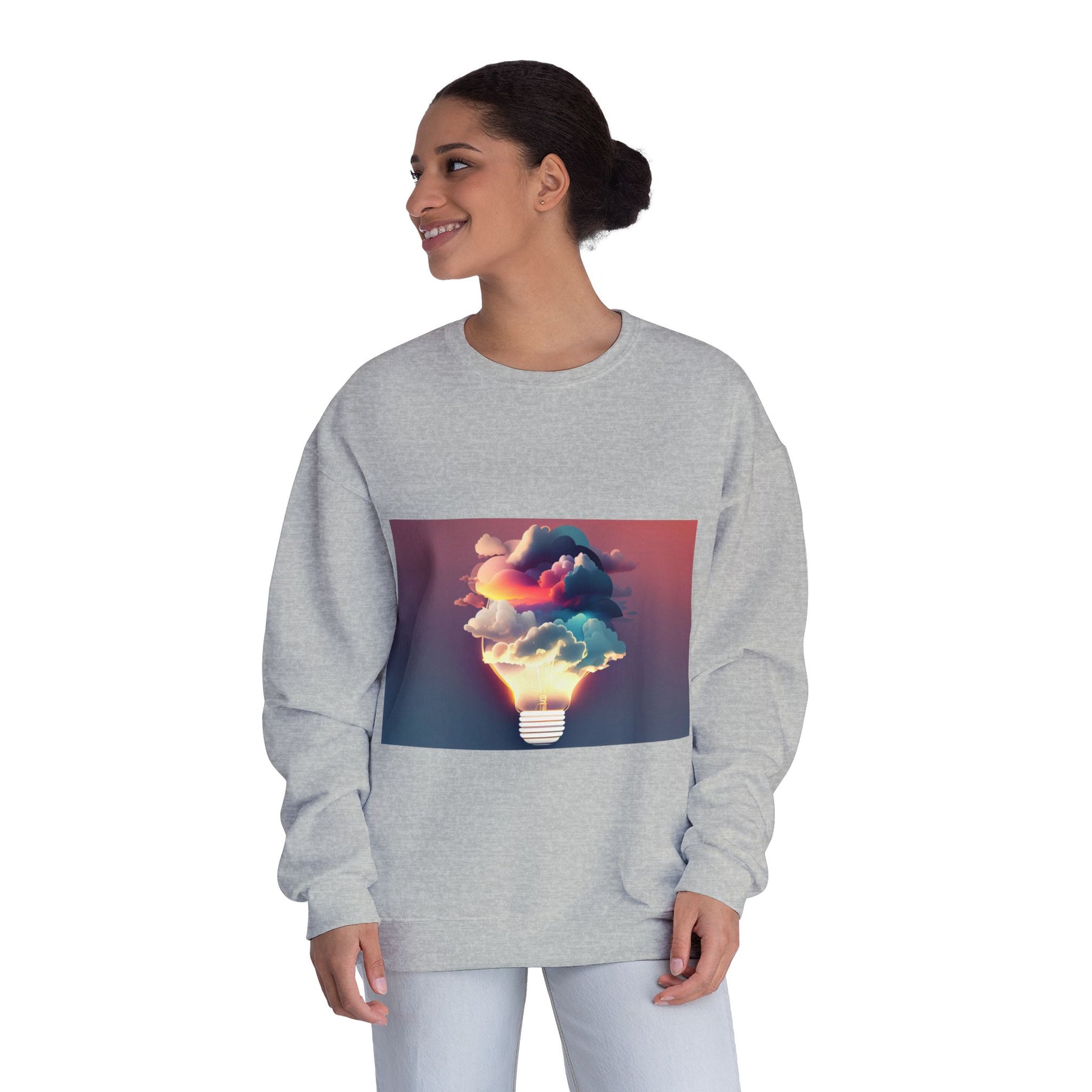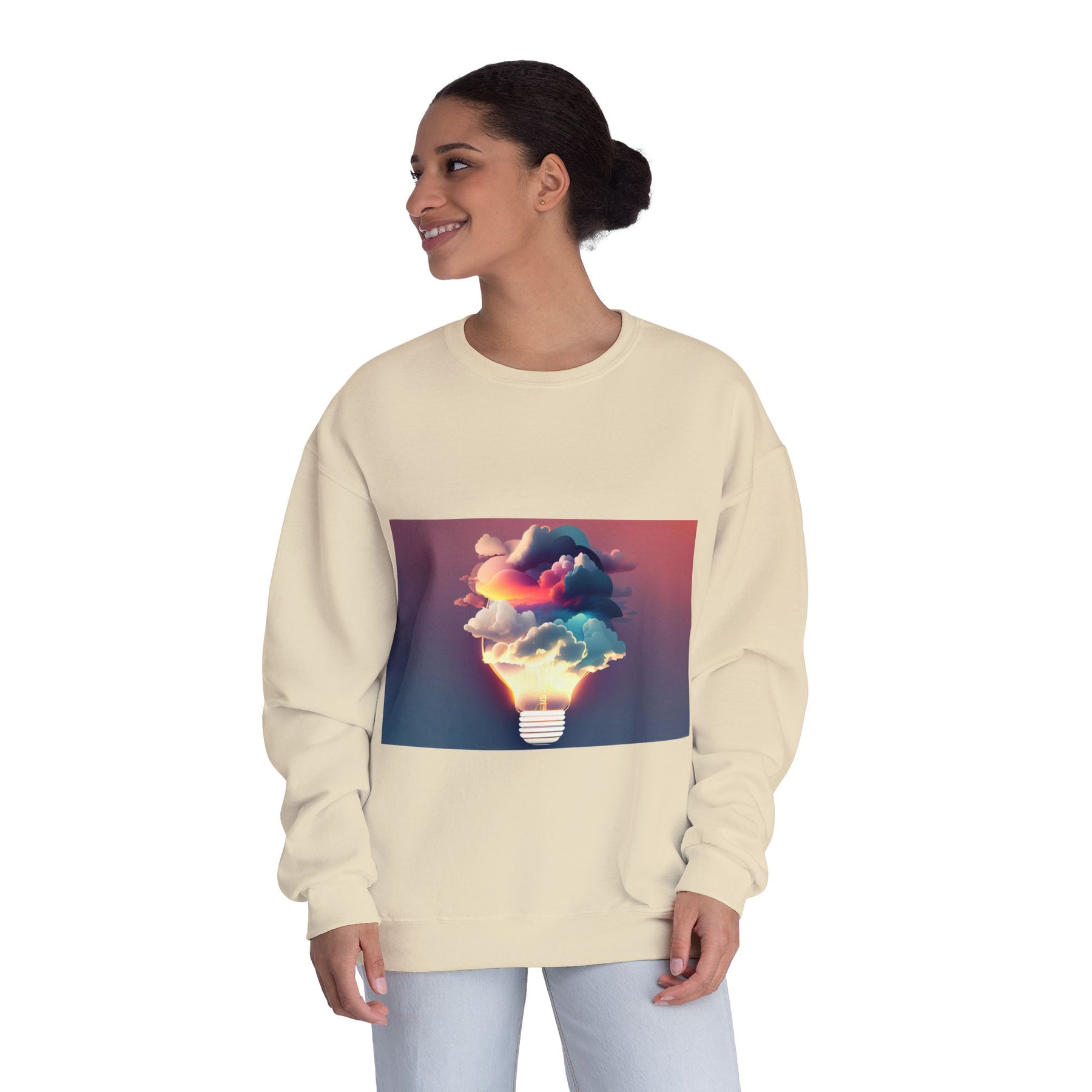 This cozy crewneck carries a spark of imaginative energy — a soft white sweatshirt printed with a dreamy lightbulb-cloud design that feels like inspiration you can wear. The image blends warm sunset hues and cool blues into a floating cloud that pours from a glowing bulb, giving a subtle, artful pop against the clean, relaxed silhouette. It layers easily over tees or pairs with jeans for long studio sessions, late-night brainstorming, gallery visits, or quiet walks when your mind needs a little color. The fabric has a substantial, brushed interior that holds shape and warmth while staying soft next to the skin, so the sweatshirt becomes a go-to for creative routines and everyday comfort.
