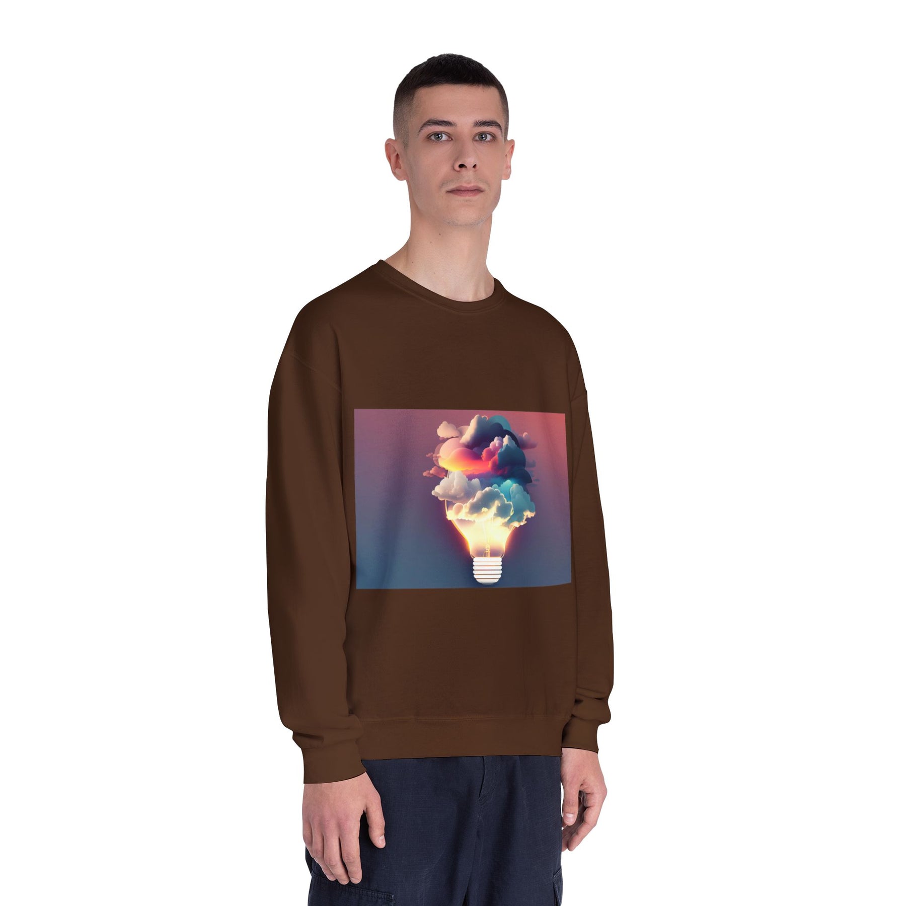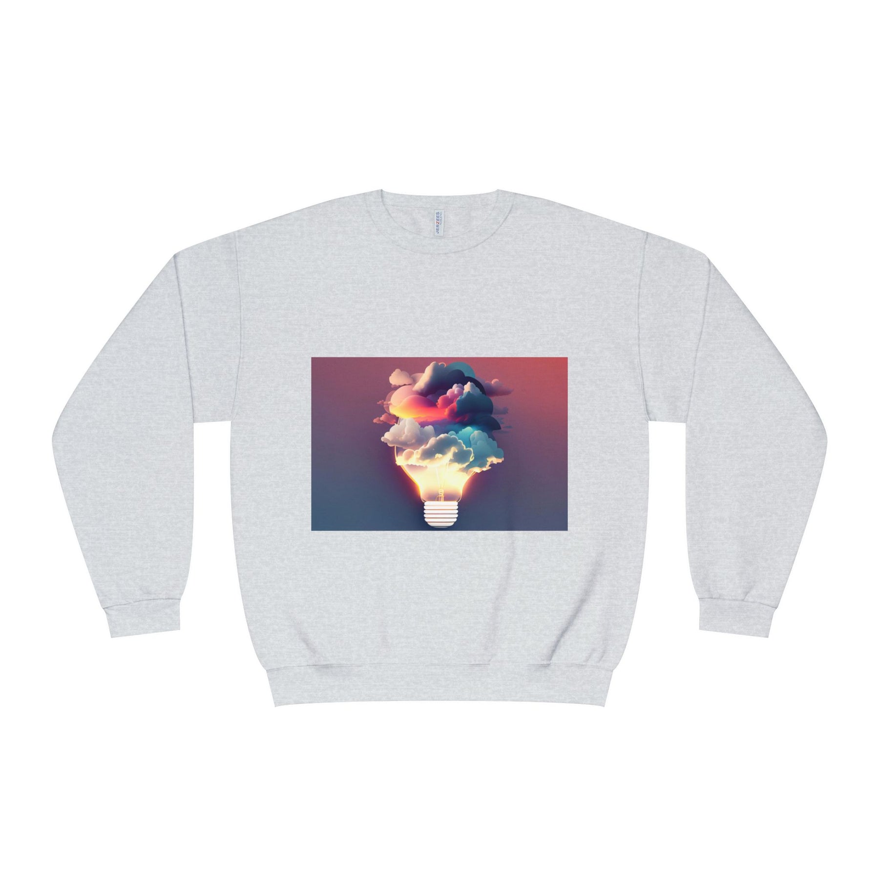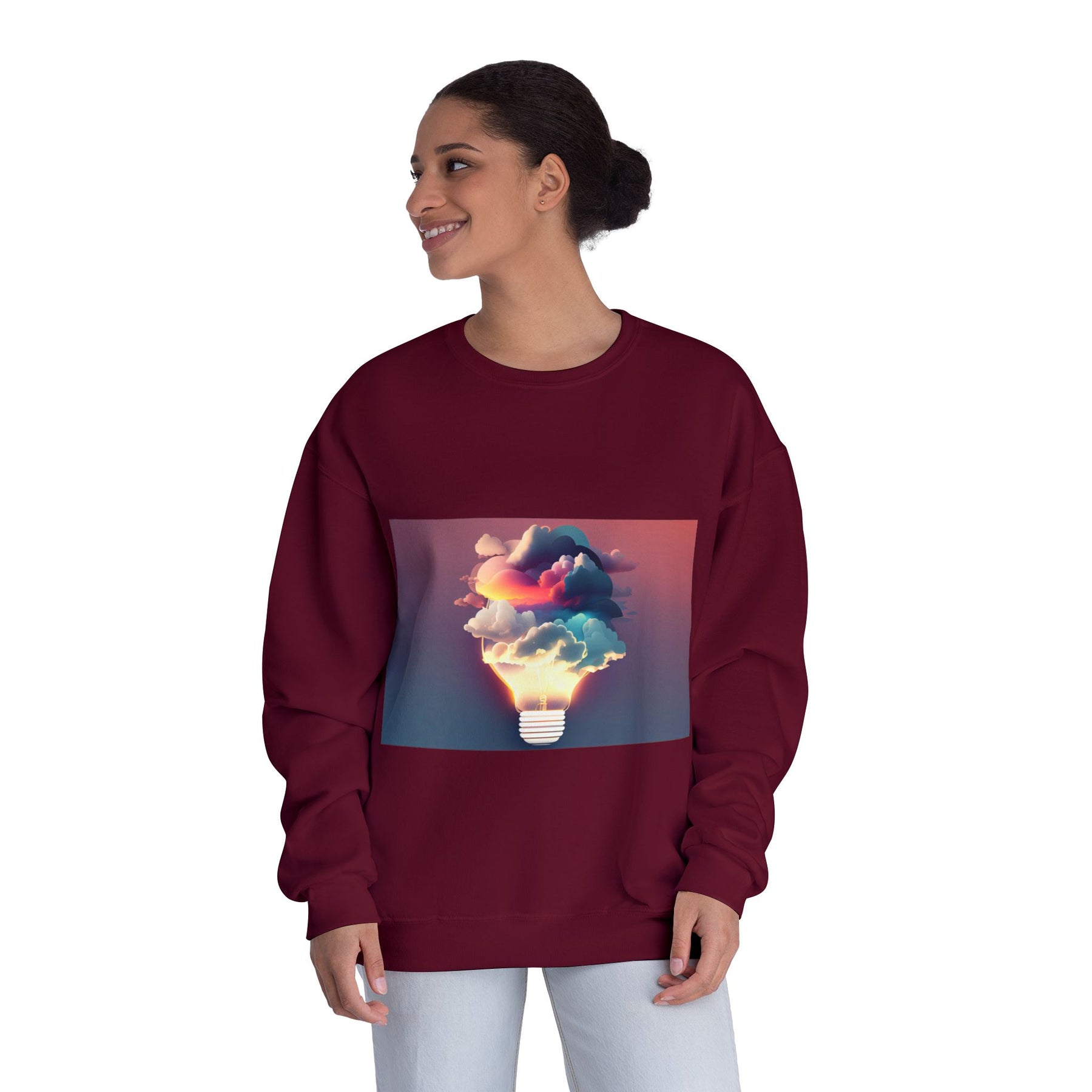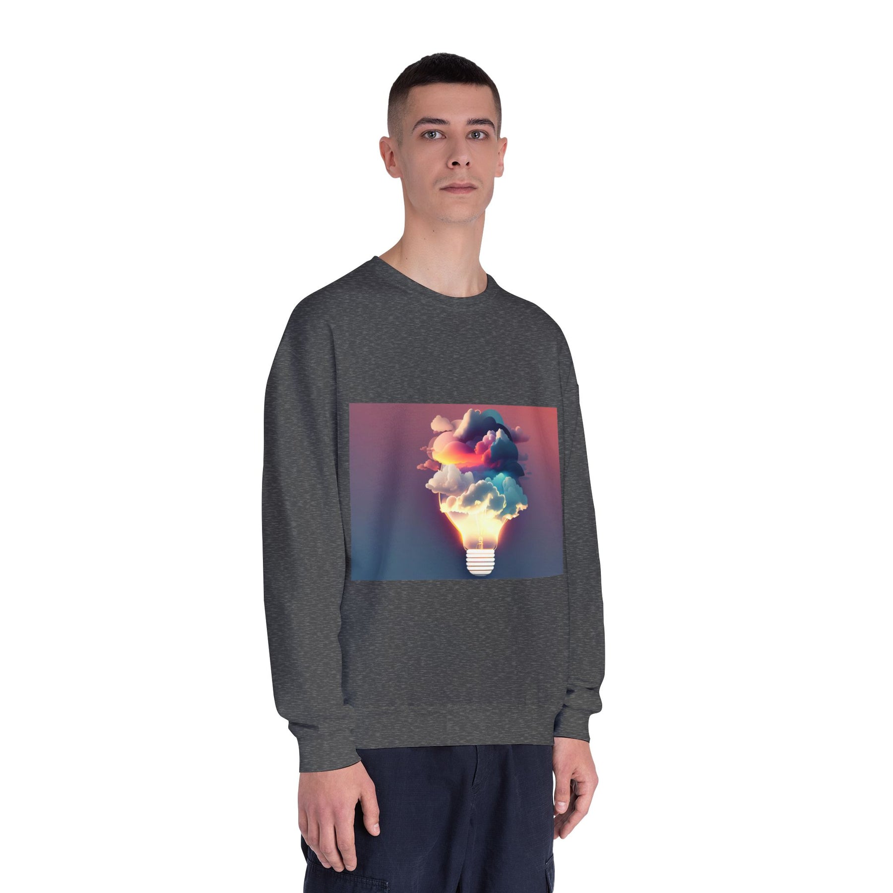 This cozy crewneck carries a spark of imaginative energy — a soft white sweatshirt printed with a dreamy lightbulb-cloud design that feels like inspiration you can wear. The image blends warm sunset hues and cool blues into a floating cloud that pours from a glowing bulb, giving a subtle, artful pop against the clean, relaxed silhouette. It layers easily over tees or pairs with jeans for long studio sessions, late-night brainstorming, gallery visits, or quiet walks when your mind needs a little color. The fabric has a substantial, brushed interior that holds shape and warmth while staying soft next to the skin, so the sweatshirt becomes a go-to for creative routines and everyday comfort.