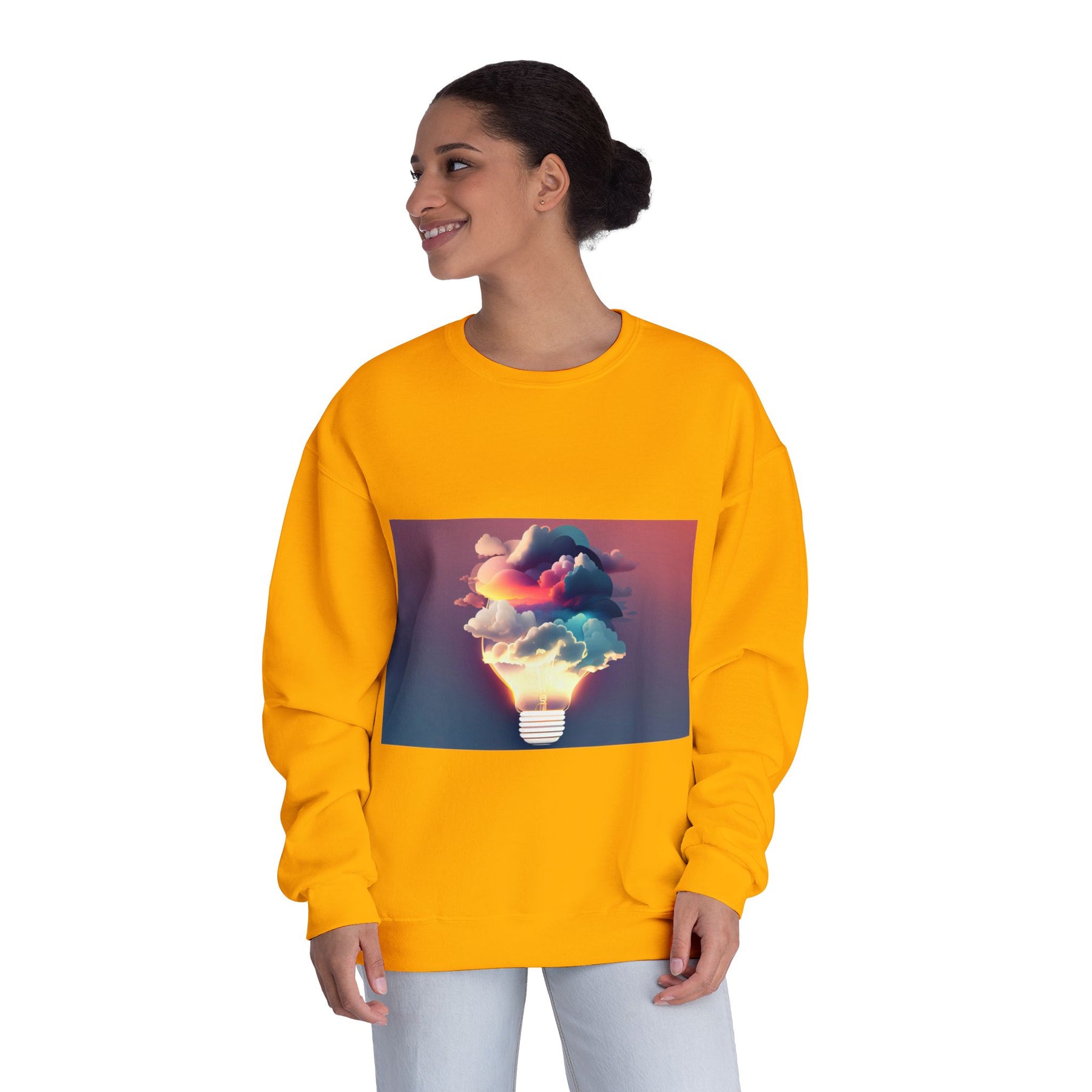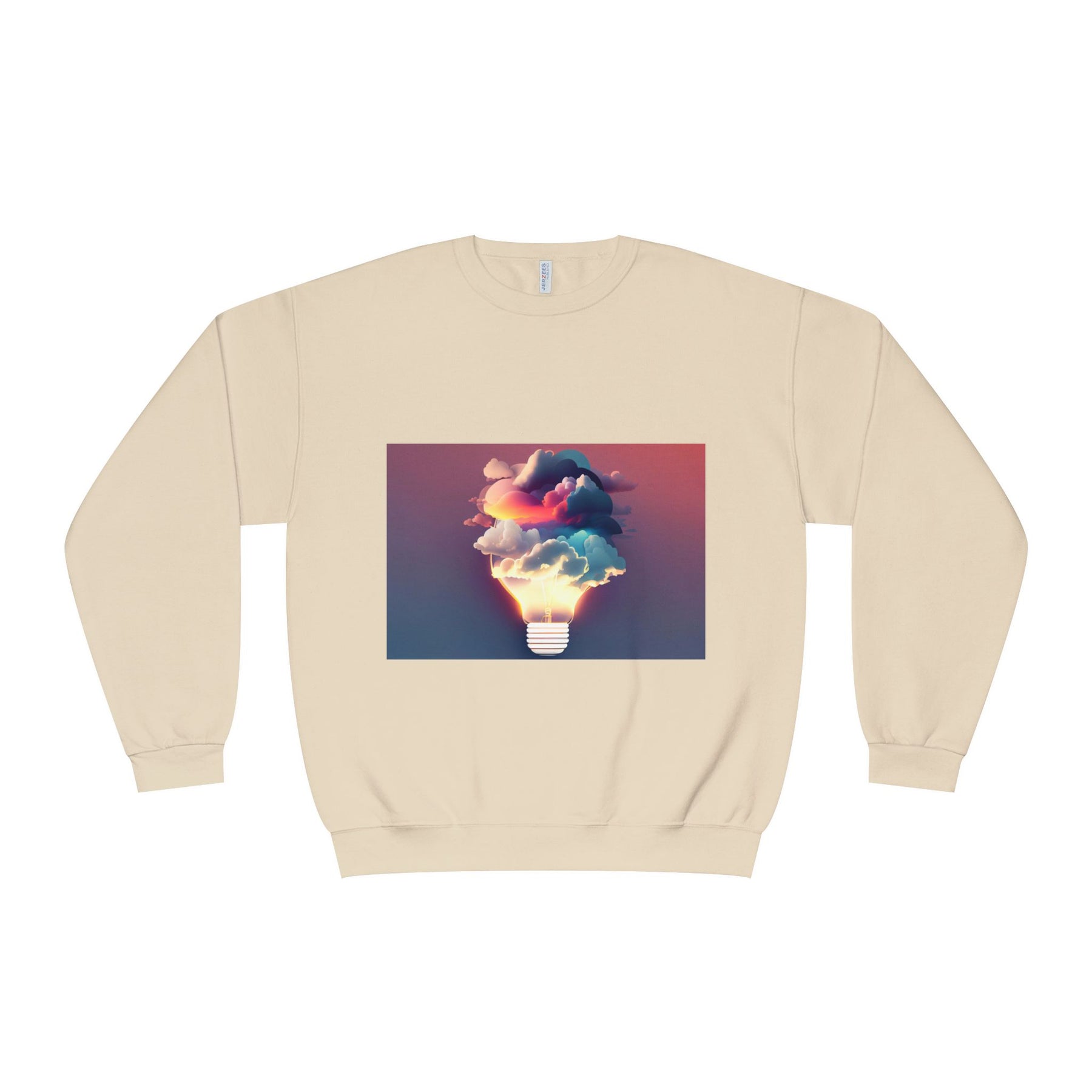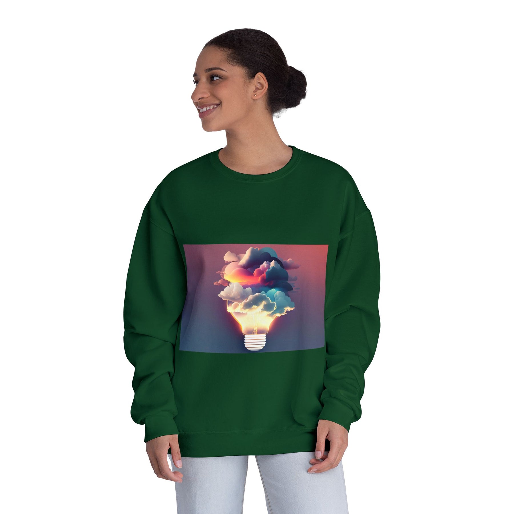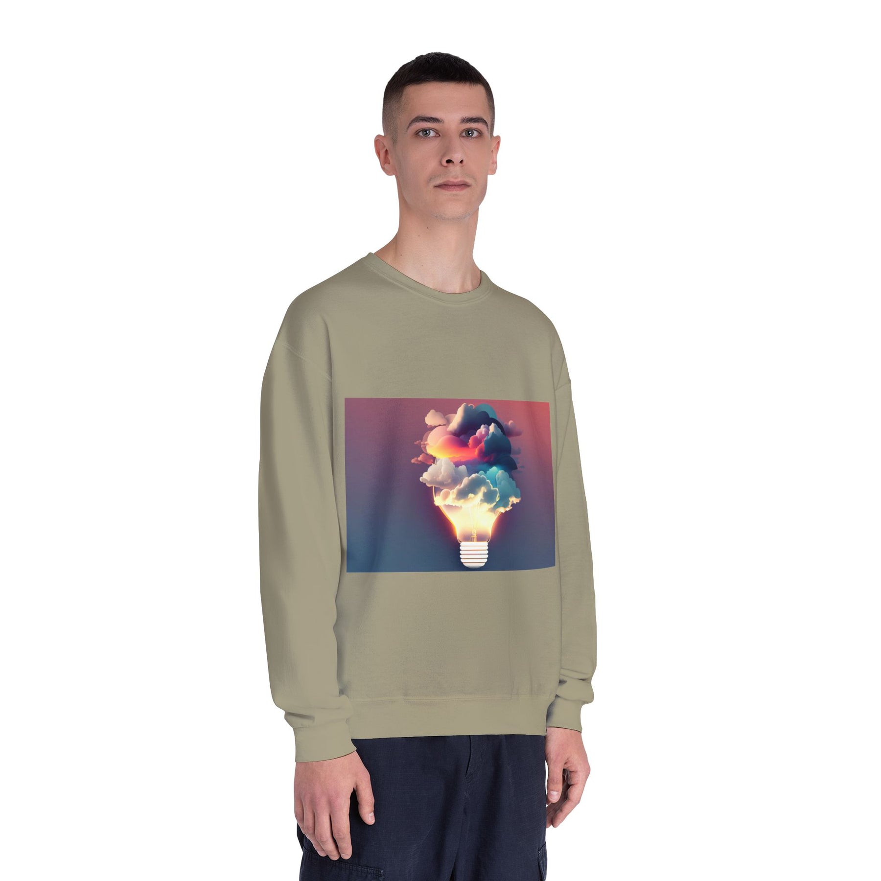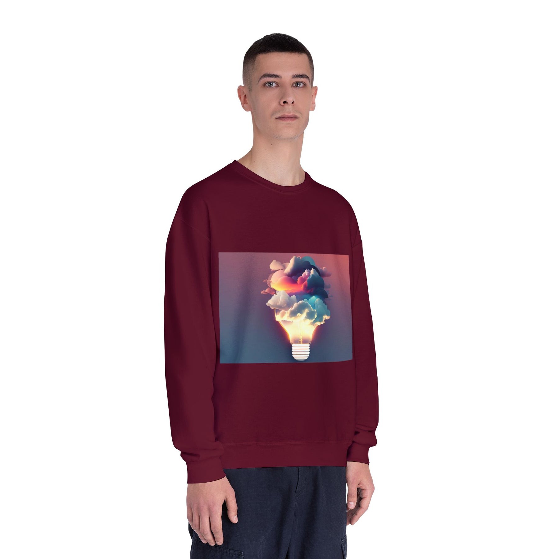 This cozy crewneck carries a spark of imaginative energy — a soft white sweatshirt printed with a dreamy lightbulb-cloud design that feels like inspiration you can wear. The image blends warm sunset hues and cool blues into a floating cloud that pours from a glowing bulb, giving a subtle, artful pop against the clean, relaxed silhouette. It layers easily over tees or pairs with jeans for long studio sessions, late-night brainstorming, gallery visits, or quiet walks when your mind needs a little color. The fabric has a substantial, brushed interior that holds shape and warmth while staying soft next to the skin, so the sweatshirt becomes a go-to for creative routines and everyday comfort.
