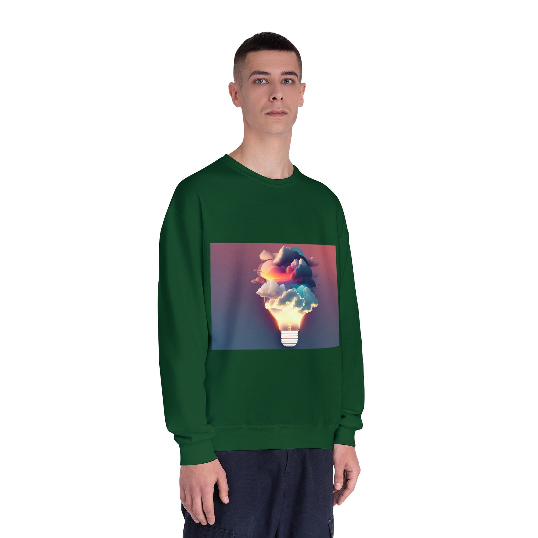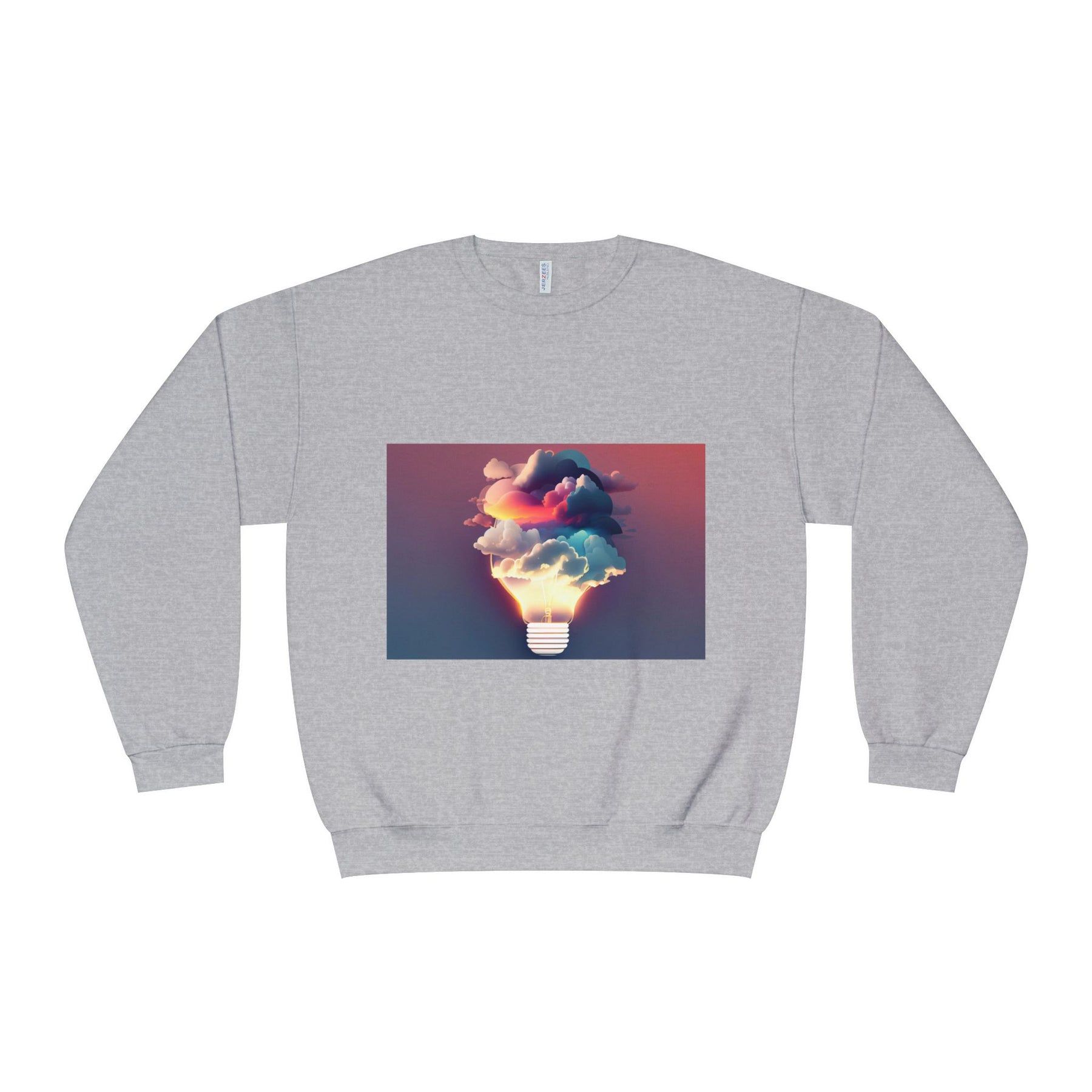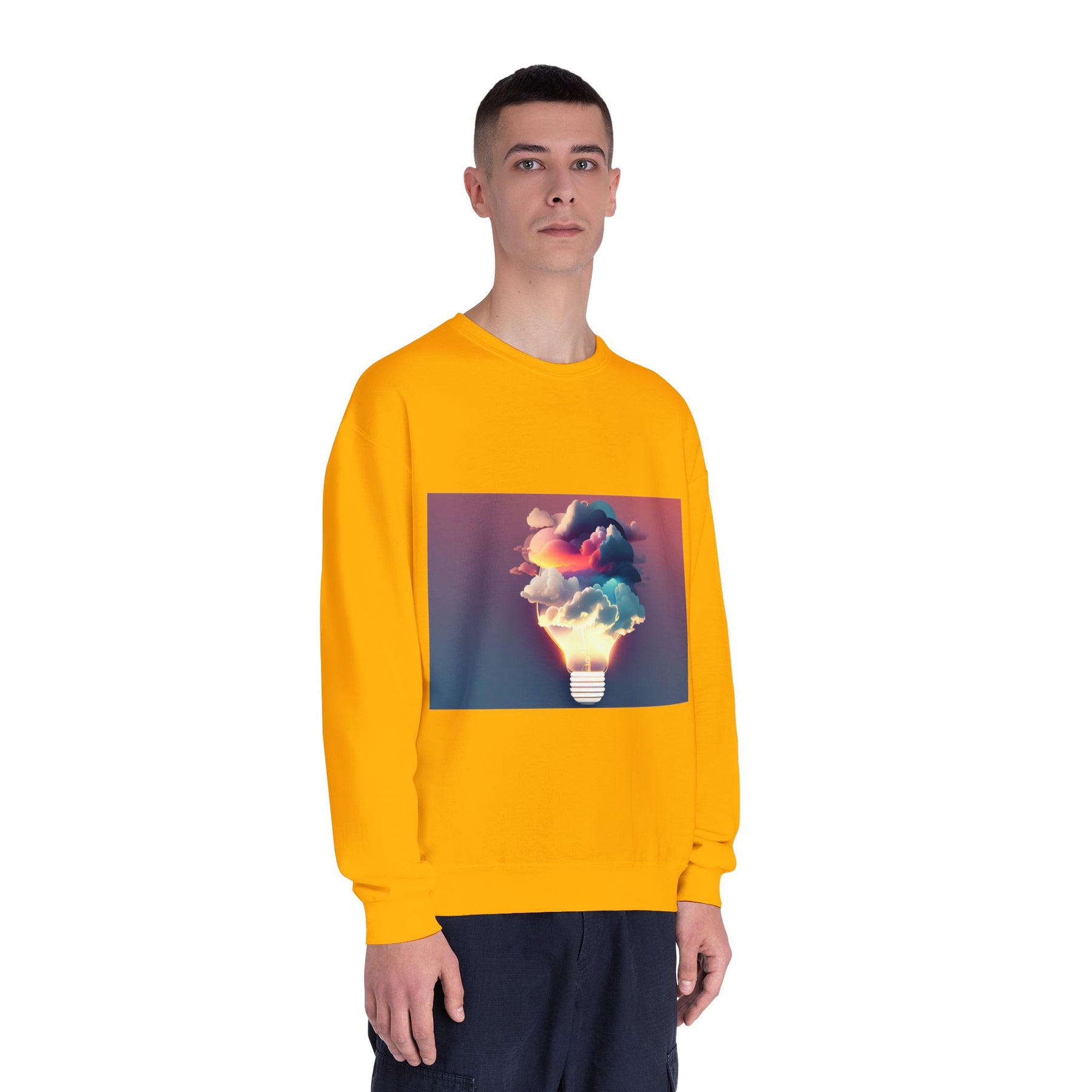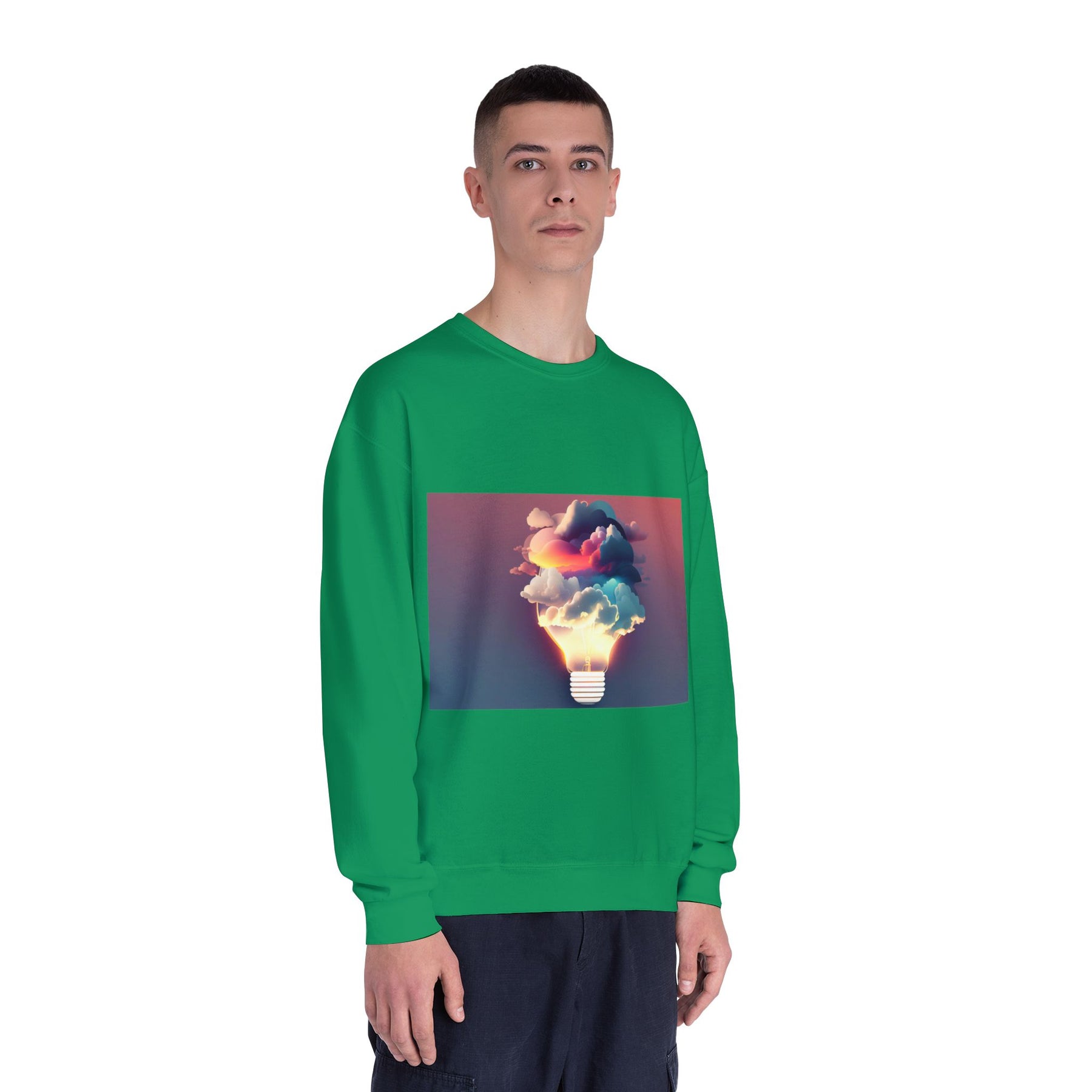 This cozy crewneck carries a spark of imaginative energy — a soft white sweatshirt printed with a dreamy lightbulb-cloud design that feels like inspiration you can wear. The image blends warm sunset hues and cool blues into a floating cloud that pours from a glowing bulb, giving a subtle, artful pop against the clean, relaxed silhouette. It layers easily over tees or pairs with jeans for long studio sessions, late-night brainstorming, gallery visits, or quiet walks when your mind needs a little color. The fabric has a substantial, brushed interior that holds shape and warmth while staying soft next to the skin, so the sweatshirt becomes a go-to for creative routines and everyday comfort.