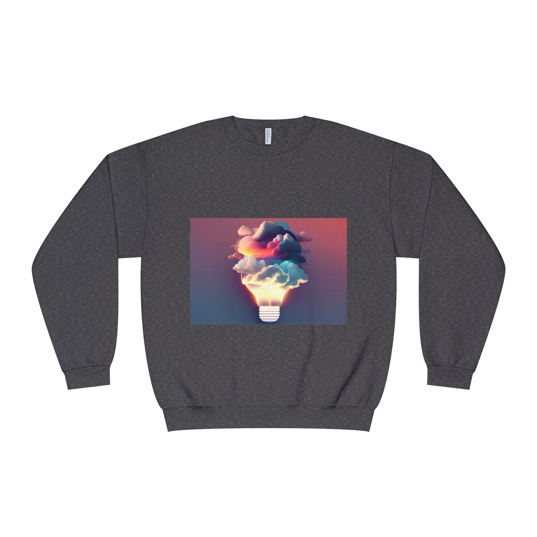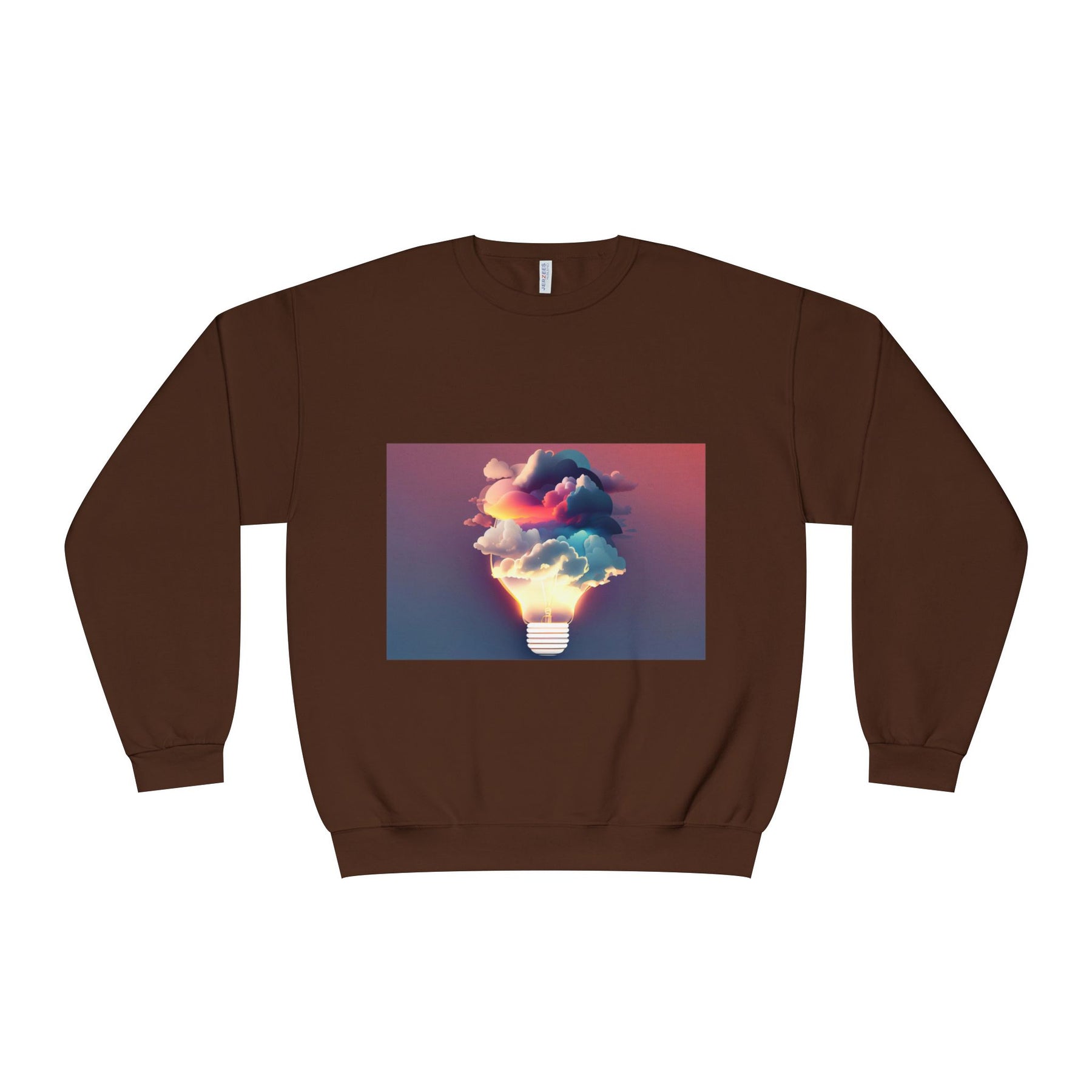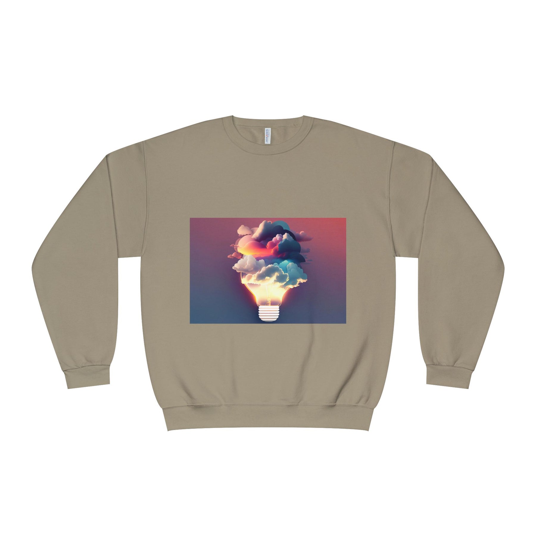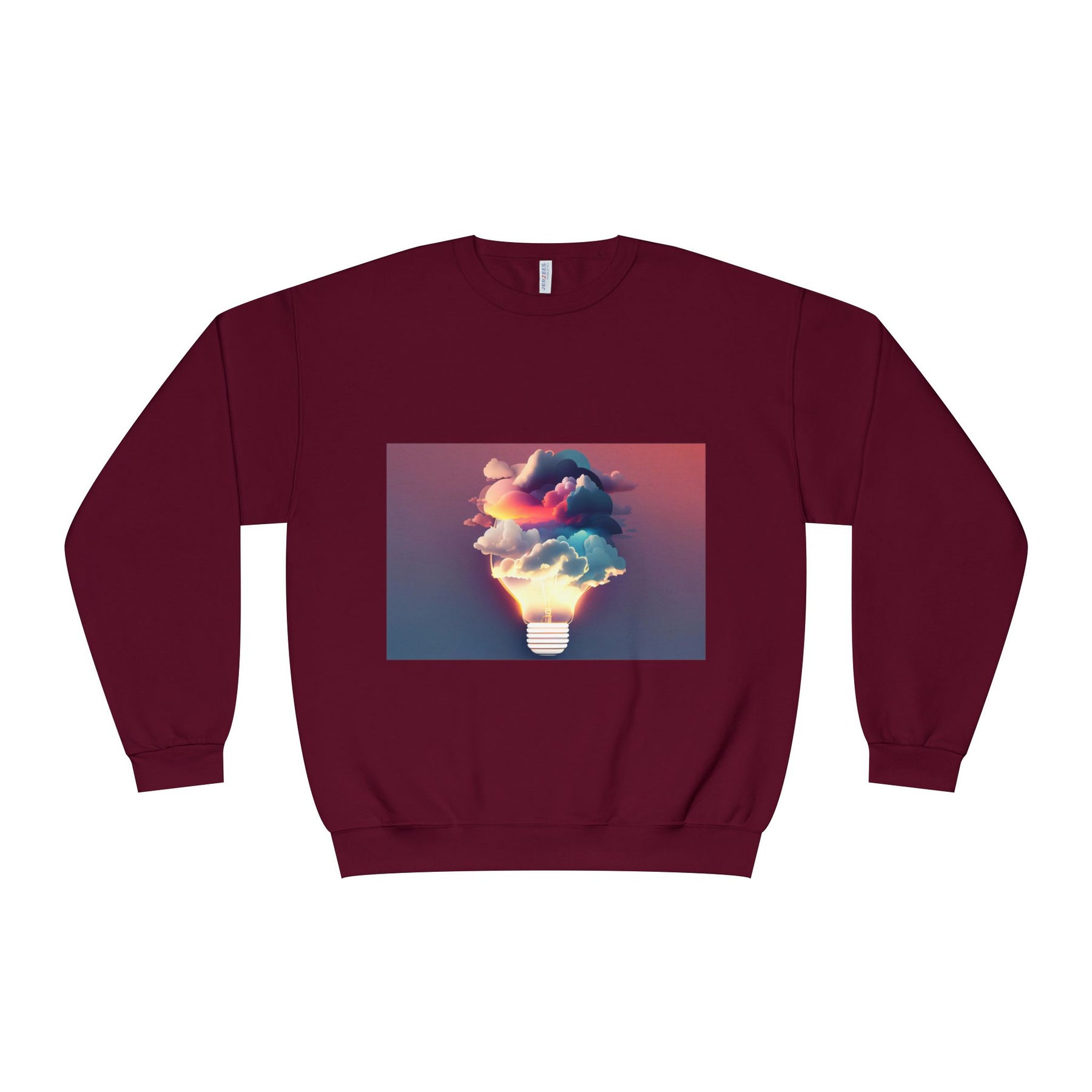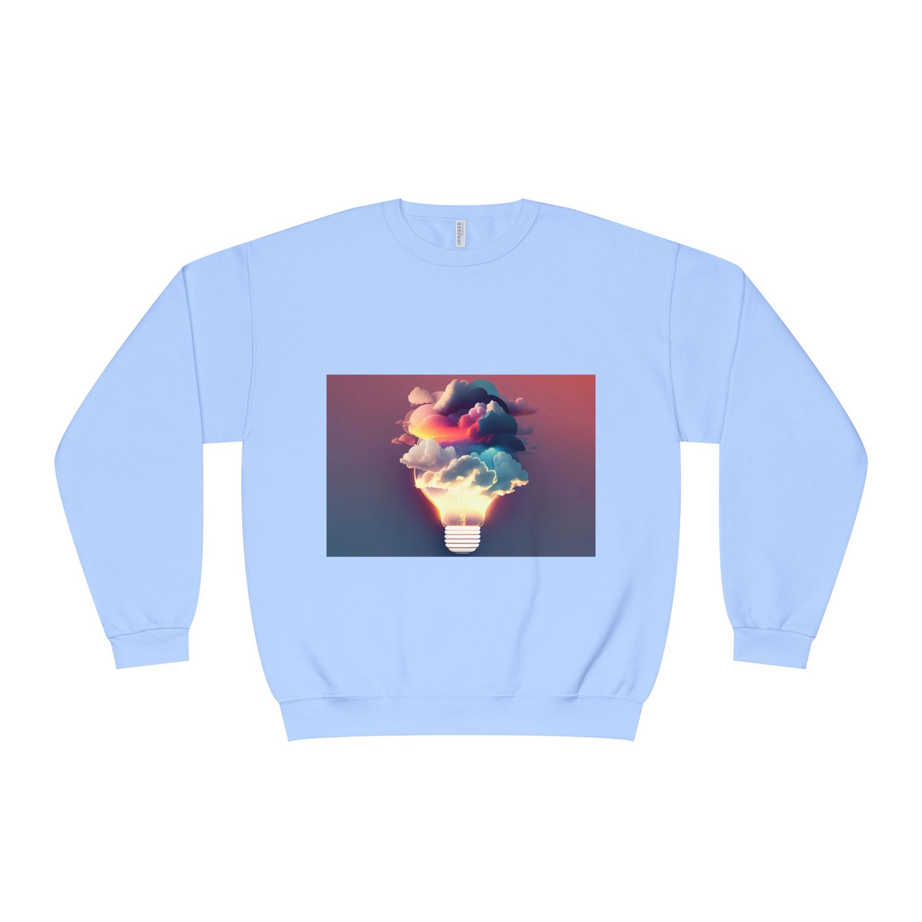 This cozy crewneck carries a spark of imaginative energy — a soft white sweatshirt printed with a dreamy lightbulb-cloud design that feels like inspiration you can wear. The image blends warm sunset hues and cool blues into a floating cloud that pours from a glowing bulb, giving a subtle, artful pop against the clean, relaxed silhouette. It layers easily over tees or pairs with jeans for long studio sessions, late-night brainstorming, gallery visits, or quiet walks when your mind needs a little color. The fabric has a substantial, brushed interior that holds shape and warmth while staying soft next to the skin, so the sweatshirt becomes a go-to for creative routines and everyday comfort.
